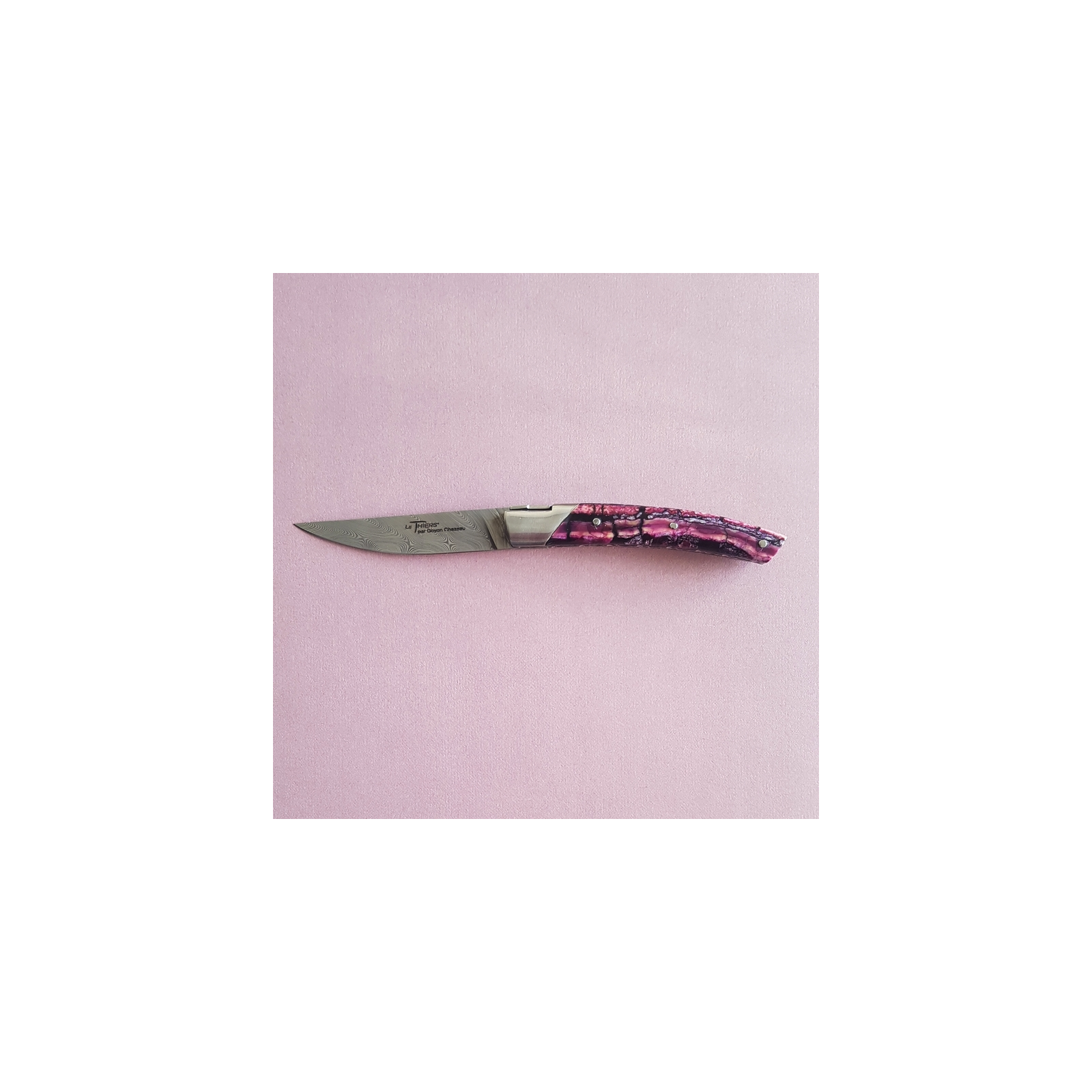 Special edition of the Le Thiers Pirou 10cm knife by GOYON-CHAZEAU with "Twist" industrial damascus blade and purple-tinted mammoth molar handle.