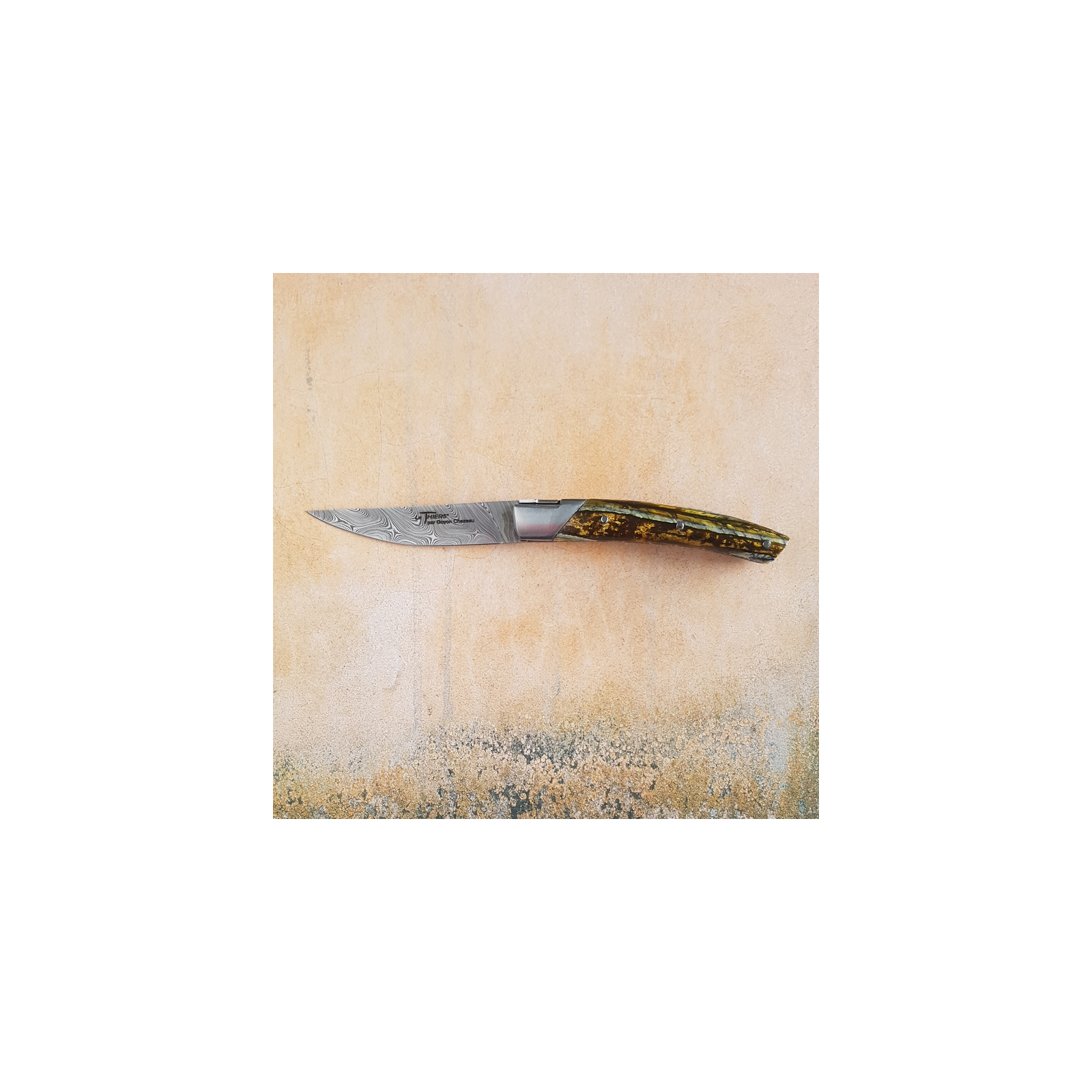 Special edition of the Le Thiers Pirou 10cm knife by GOYON-CHAZEAU with "Twist" industrial damascus blade and brown and yellow-tinted mammoth molar handle.