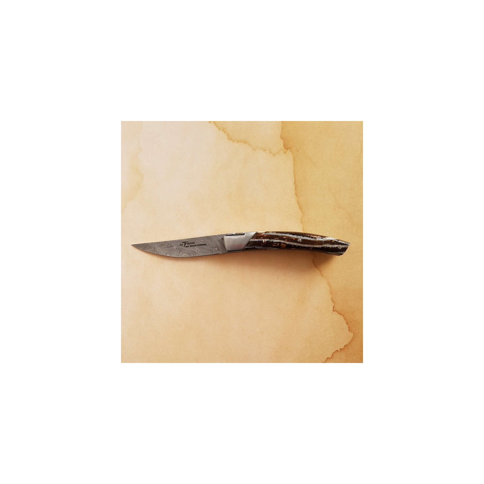 Special edition of the Le Thiers Pirou 10cm knife by GOYON-CHAZEAU with "Twist" industrial damascus blade and brown-tinted mammoth molar handle.