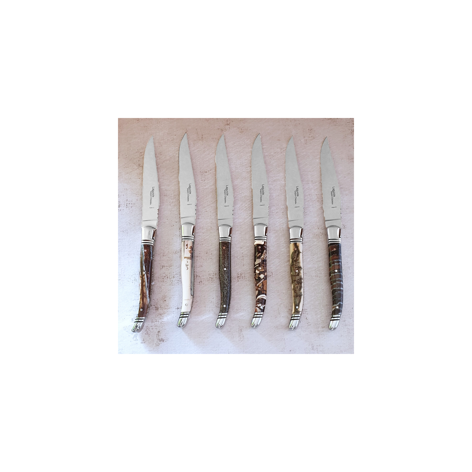 With the desire to always go further in our artisanal creations, we present this premium set of 6 Laguiole forged table knives, handmade with mammoth variation handles.