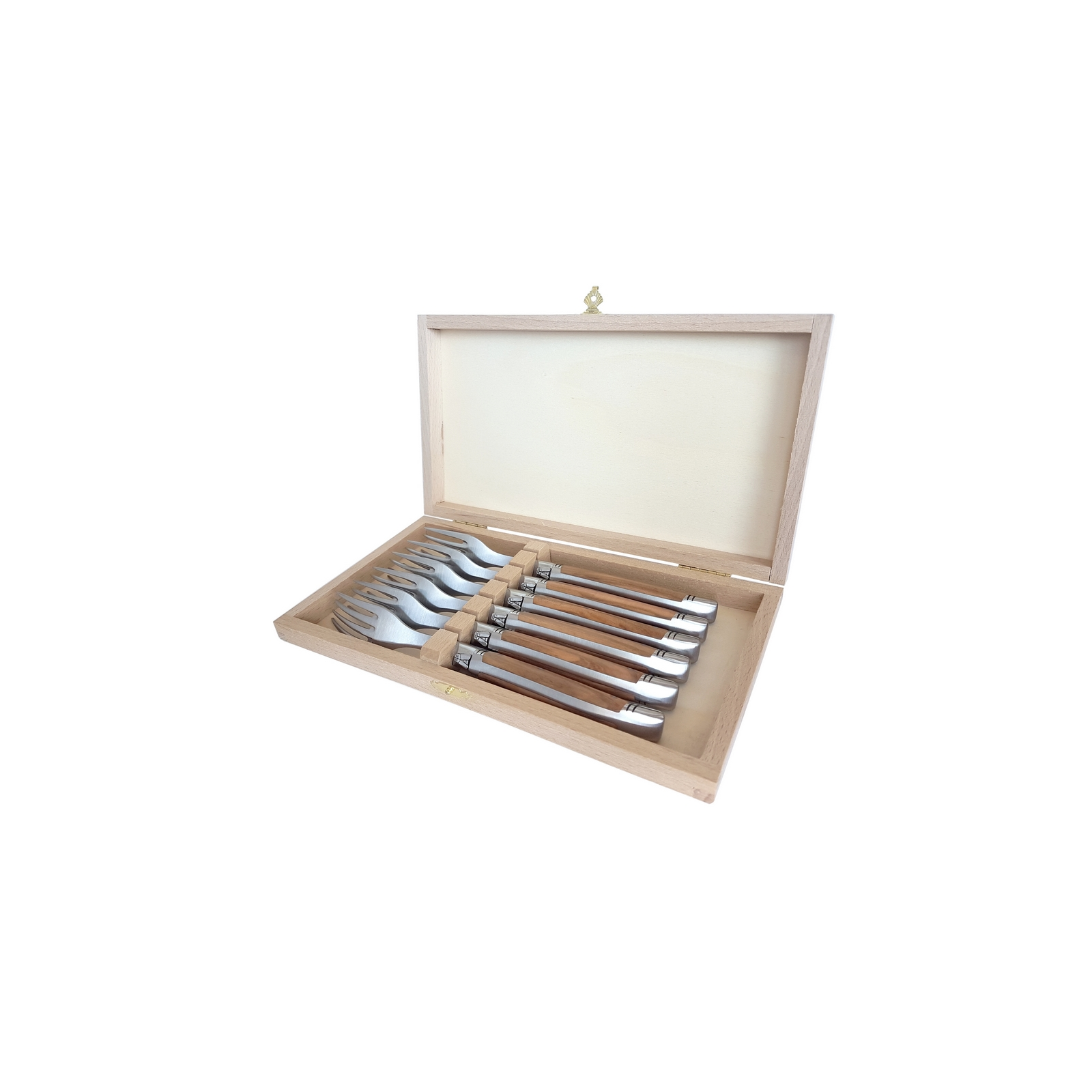 The version "Wooden handles" offers boxes of forks of the same wood or 6 assorted woods: boxwood, olive wood, juniper wood, rosewood, kingwood and snakewood.