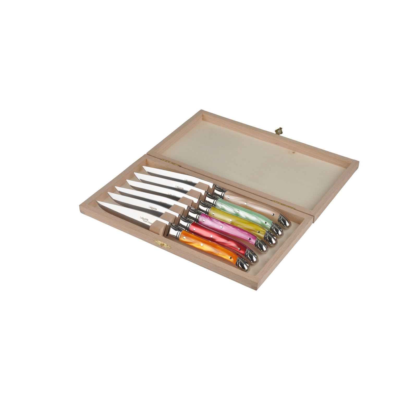 This set of 6 knives presents same color handles or 6 assorted colors handles.