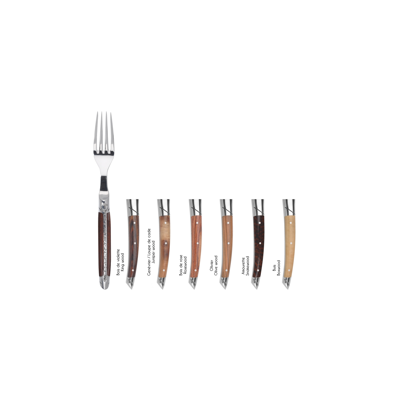 Handles are in boxwood, olive, juniper, rosewood, kingwood, snakewood, tuja, pistachio, birch wod, ebony, marble wood and wenge.