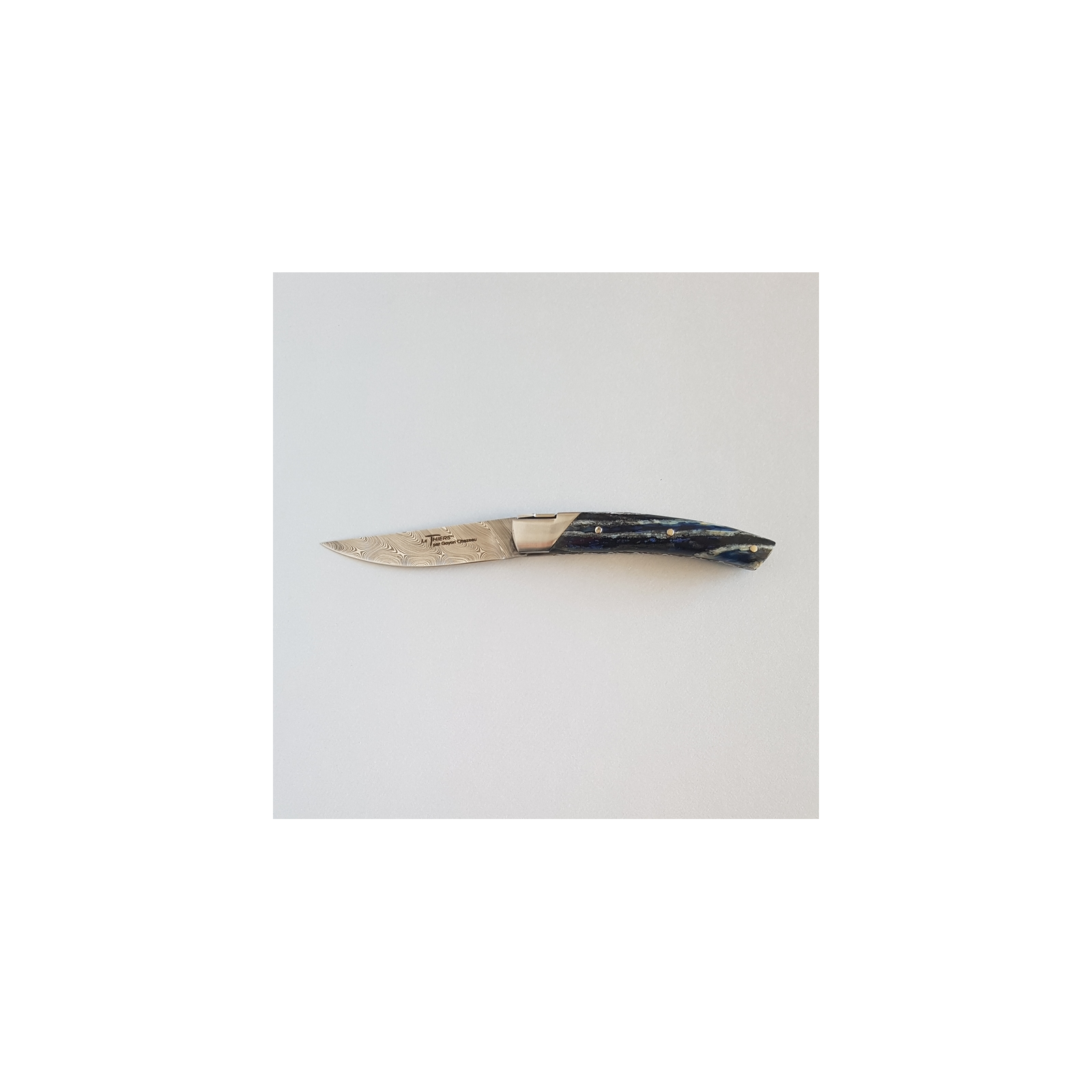 Edition spéciale du couteau Le Thiers Pirou 10cm par GOYON-CHAZEAU avec lame en damas industriel "Twist" et manche en molaire de mammouth teintée bleu marine.
