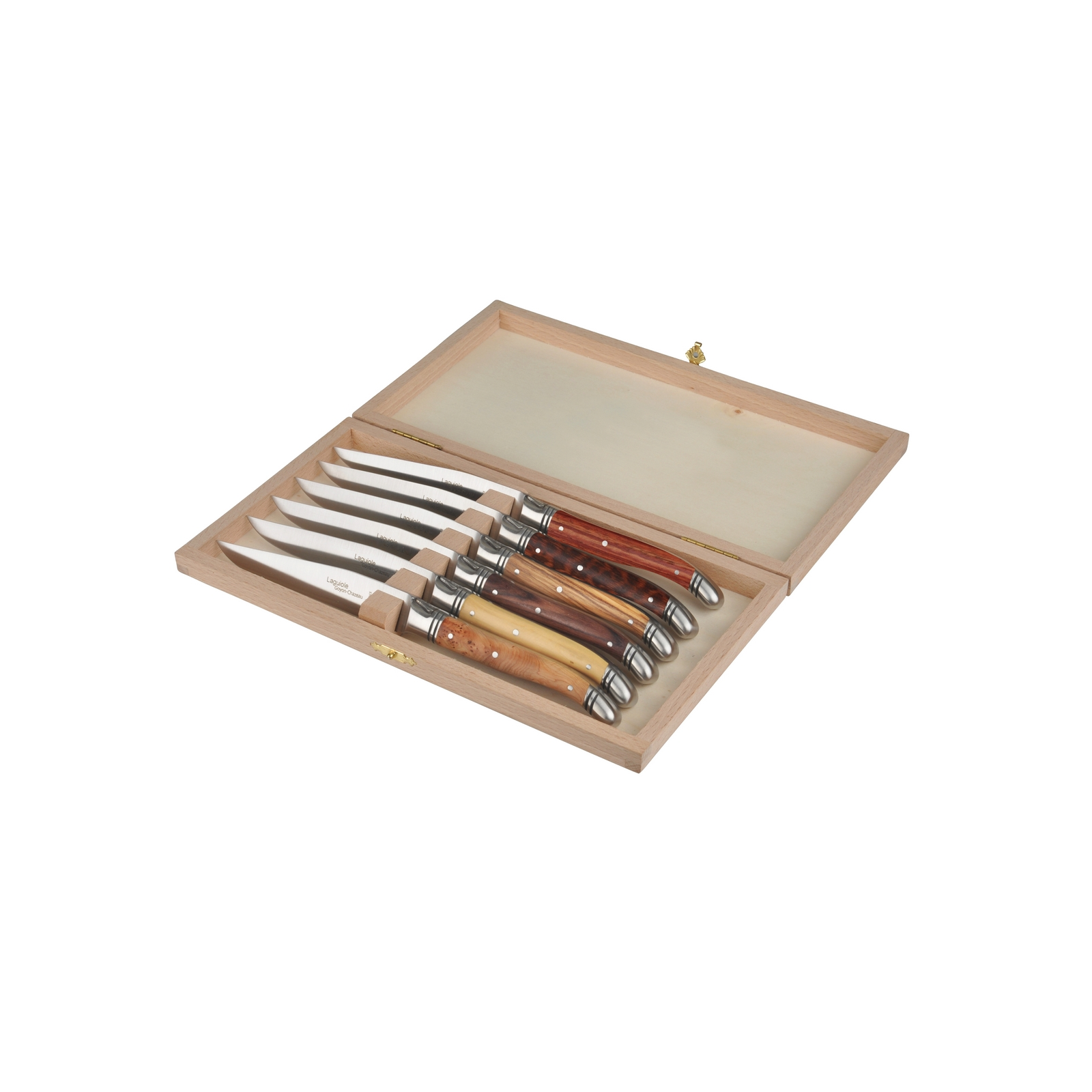 La version "Manches bois" propose des ensembles de couteaux du même bois ou de 6 bois assortis : buis, olivier, loupe de cade, bois de rose, bois de violette et amourette.