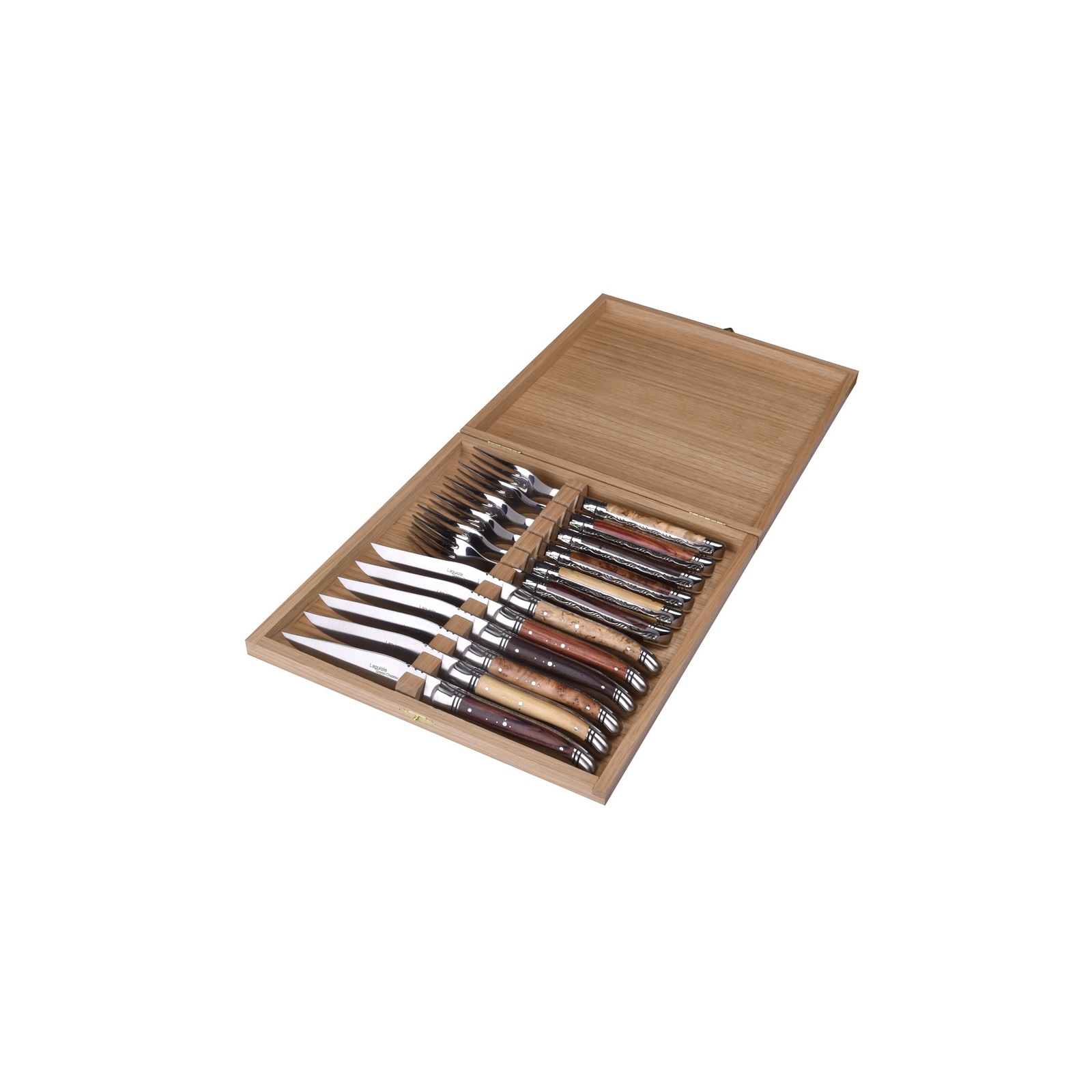 Cette ménagère 12 pcs propose 6 bois assortis : buis, olivier, cade, bois de rose, bois de violette et amourette.