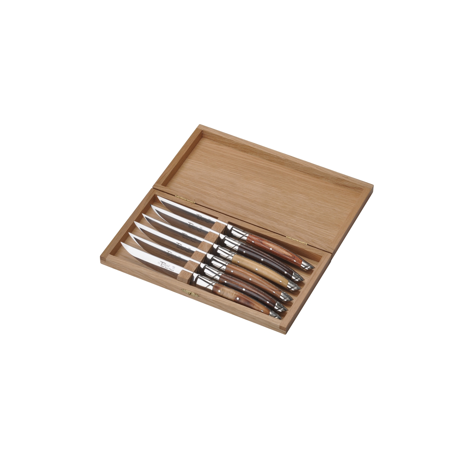 Les coffrets "Manches bois" se déclinent en ensembles du même bois ou de 6 bois assortis : buis, olivier, cade, bois de rose, bois de violette et amourette.