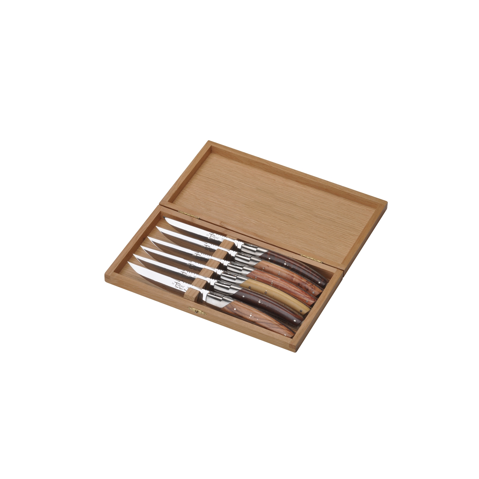 Les coffrets "Manches bois" se déclinent en ensembles du même bois ou de 6 bois assortis : buis, olivier, cade, bois de rose, bois de violette et amourette.